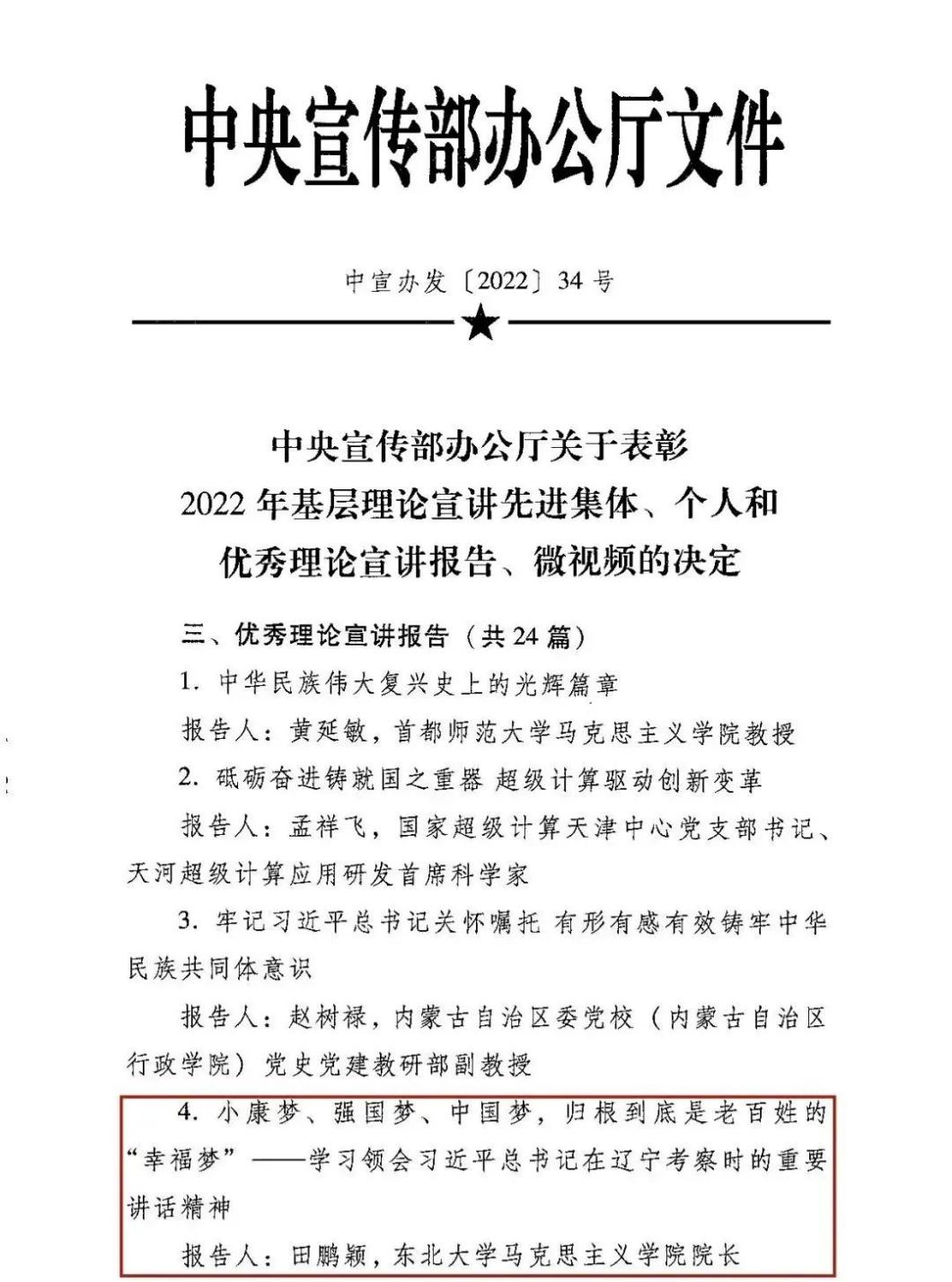 10月20日,中央宣传部办公厅公布了《关于表彰2022年基层理论宣讲先进集体、个人和优秀理论宣讲报告、微视频的决定》,麻豆 院长田鹏颖教授所作的《小康梦、强国梦、中国梦,归根到底是老百姓的“幸福梦”——学习领会习近平总书记在辽宁考察时的重要讲话精神》报告成功入选“优秀理论宣讲报告”。