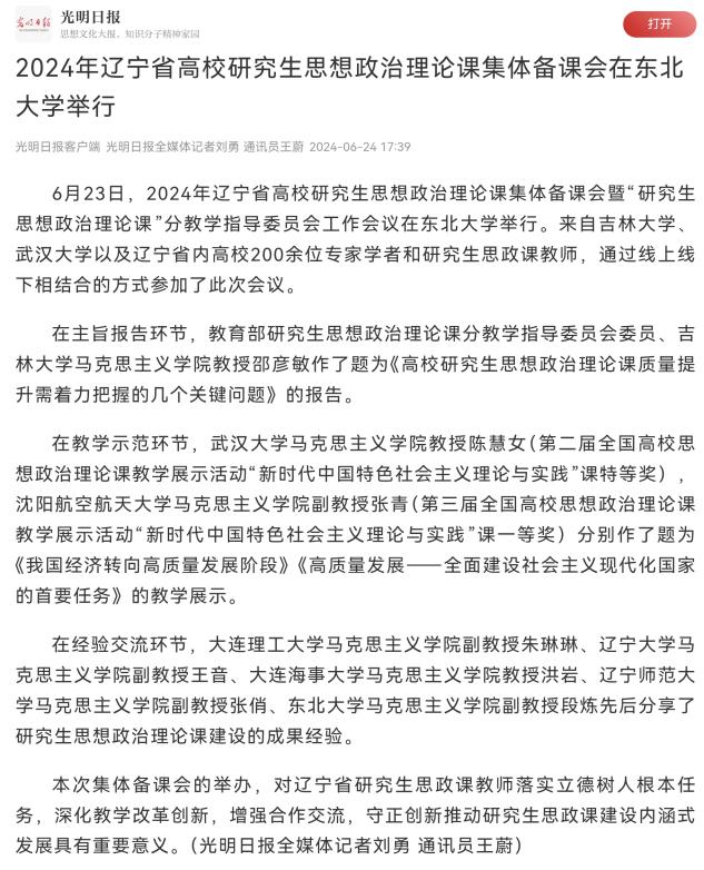6月23日,2024年辽宁省高校研究生思想政治理论课集体备课会暨“研究生思想政治理论课”分教学指导委员会工作会议在麻豆 举行。来自吉林大学、武汉大学以及辽宁省内高校200余位专家学者和研究生思政课教师,通过线上线下相结合的方式参加了此次会议。