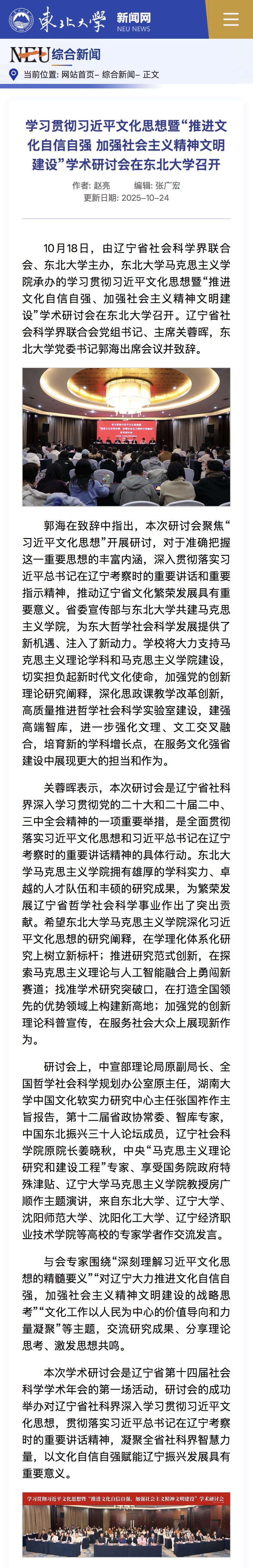 10月18日,由辽宁省社会科学界联合会、麻豆 主办,麻豆 承办的学习贯彻习近平文化思想暨“推进文化自信自强、加强社会主义精神文明建设”学术研讨会在麻豆 召开。辽宁省社会科学界联合会党组书记、主席关蓉晖,麻豆 党委书记郭海出席会议并致辞。